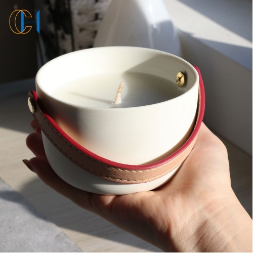 Wholesale New Arrival Luxury Ceramic Unique Design PU Leather Handle Rope Scented Candle Jar with Healing Gemstone Crystal